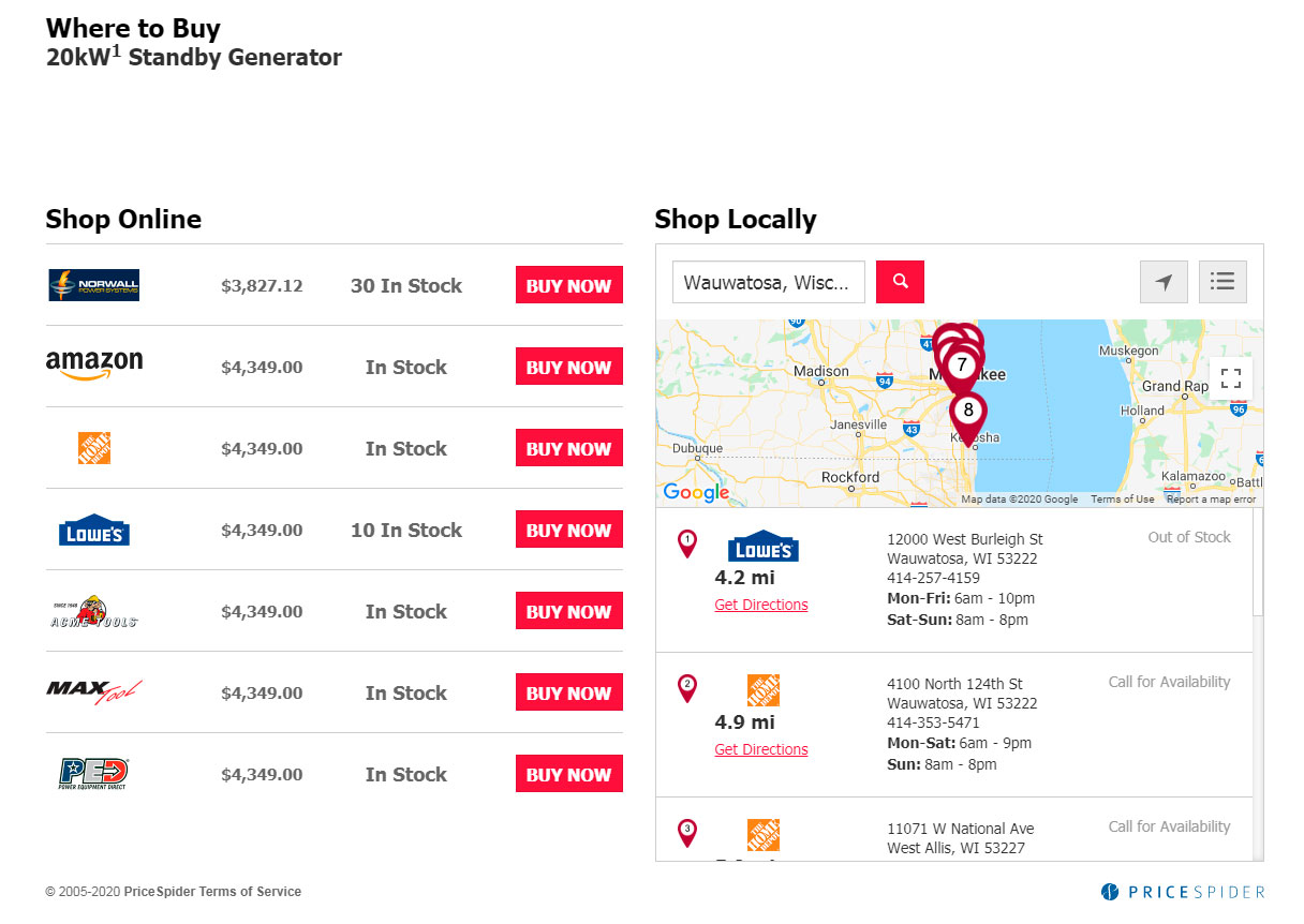 Briggs & Stratton has both local and online retailers that carry our products for your purchasing convenience. If the product is available at a retailer, there will be a “Where to Buy” button on the product pages that shows where you can find the product, its availability and price.